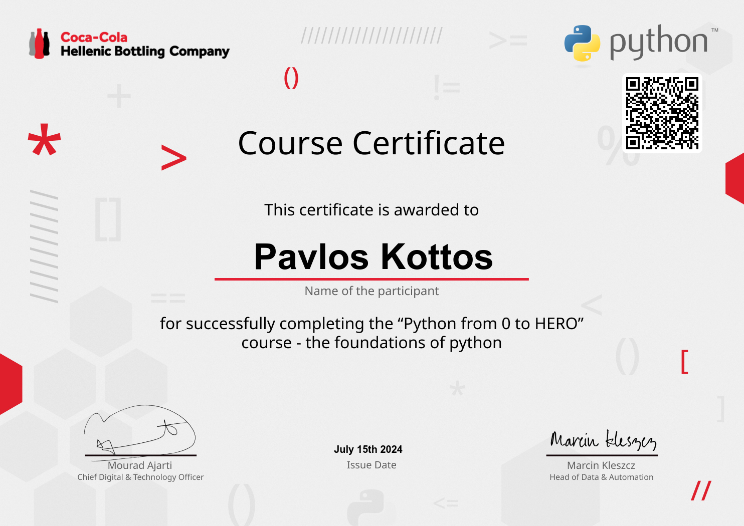 A course during which the foundations of python were taught for workflow automation, big data processing and advanced analytics.